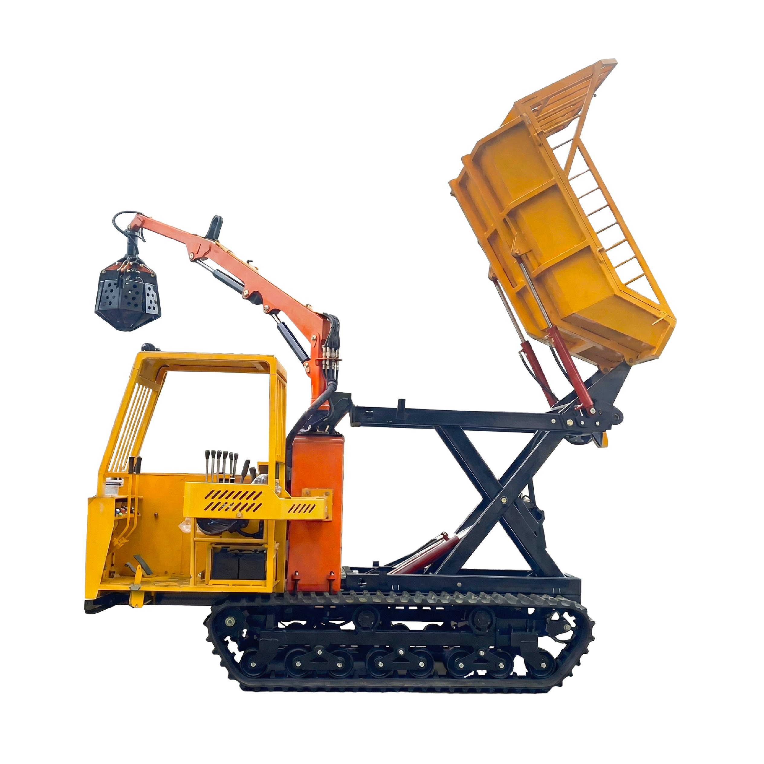 Crawler dumper dengan scissors lift hingga 2.5 meter, stabil di gambut dan ideal untuk operasional panen besar. Efisien untuk operasional harian.