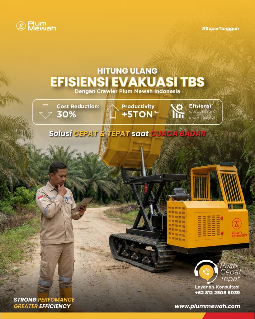 Menghitung efisiensi crawler dumper itu sederhana, tapi dampaknya besar untuk kontrol biaya dan output panen. Dengan contoh standar: